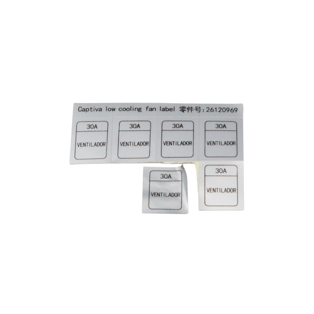 Etiqueta identificadora para el fusible del ventilador A, utilizada para señalar de forma clara y precisa la función del fusible o relevador dentro de la caja de fusibles. Facilita el diagnóstico, mantenimiento y reemplazo correcto de componentes eléctricos del vehículo.